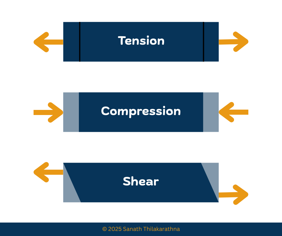 Shear Strain – This happens when one layer of a material slides past another, like pushing the top of a stack of books sideways.