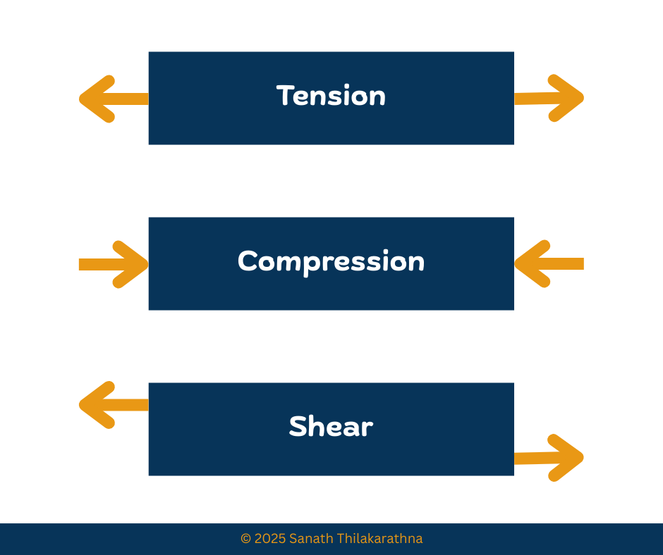 Shear Stress (\( \tau \)) – This is when parts of the material are pushed in opposite directions, like how scissors cut paper by sliding the blades past each other.